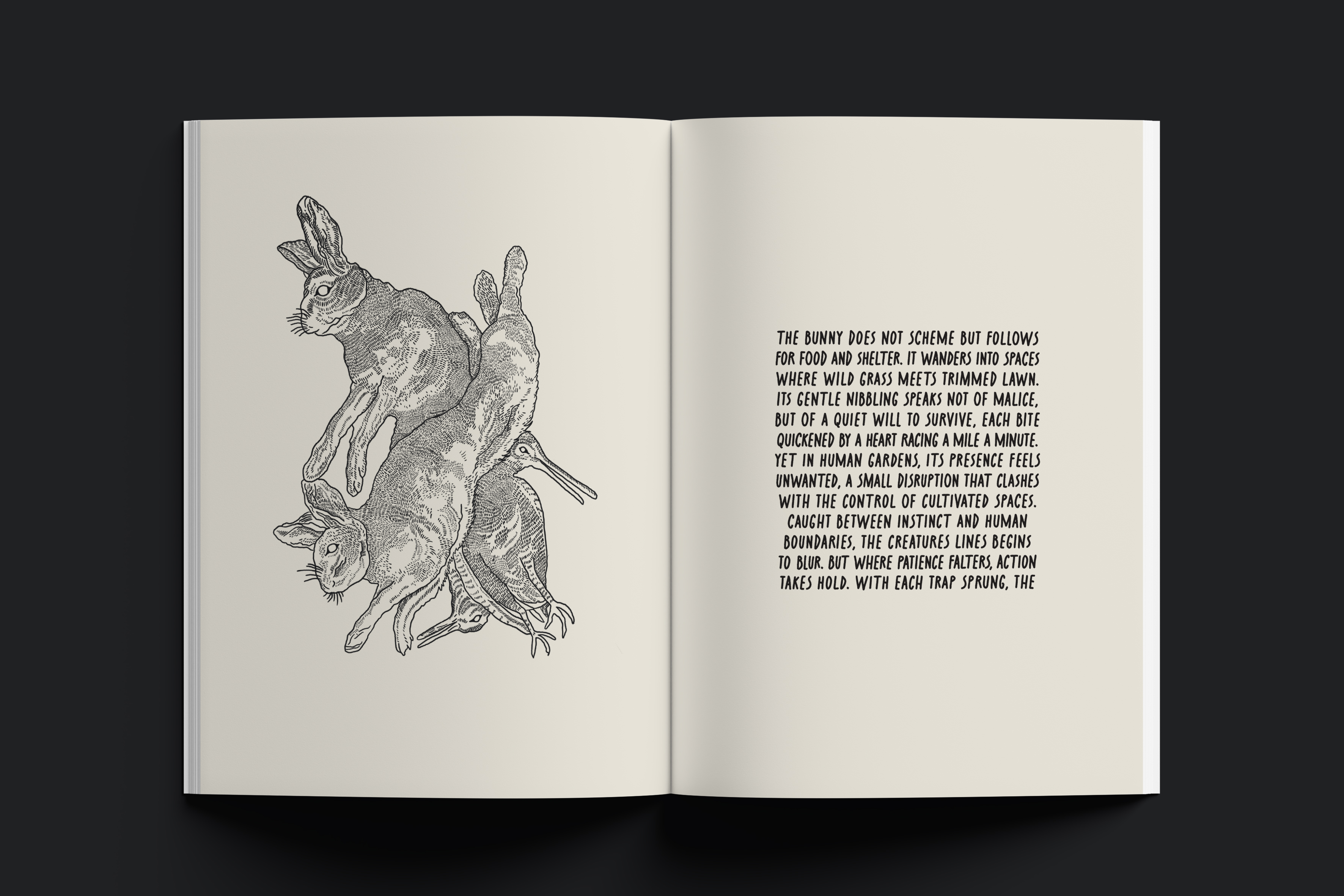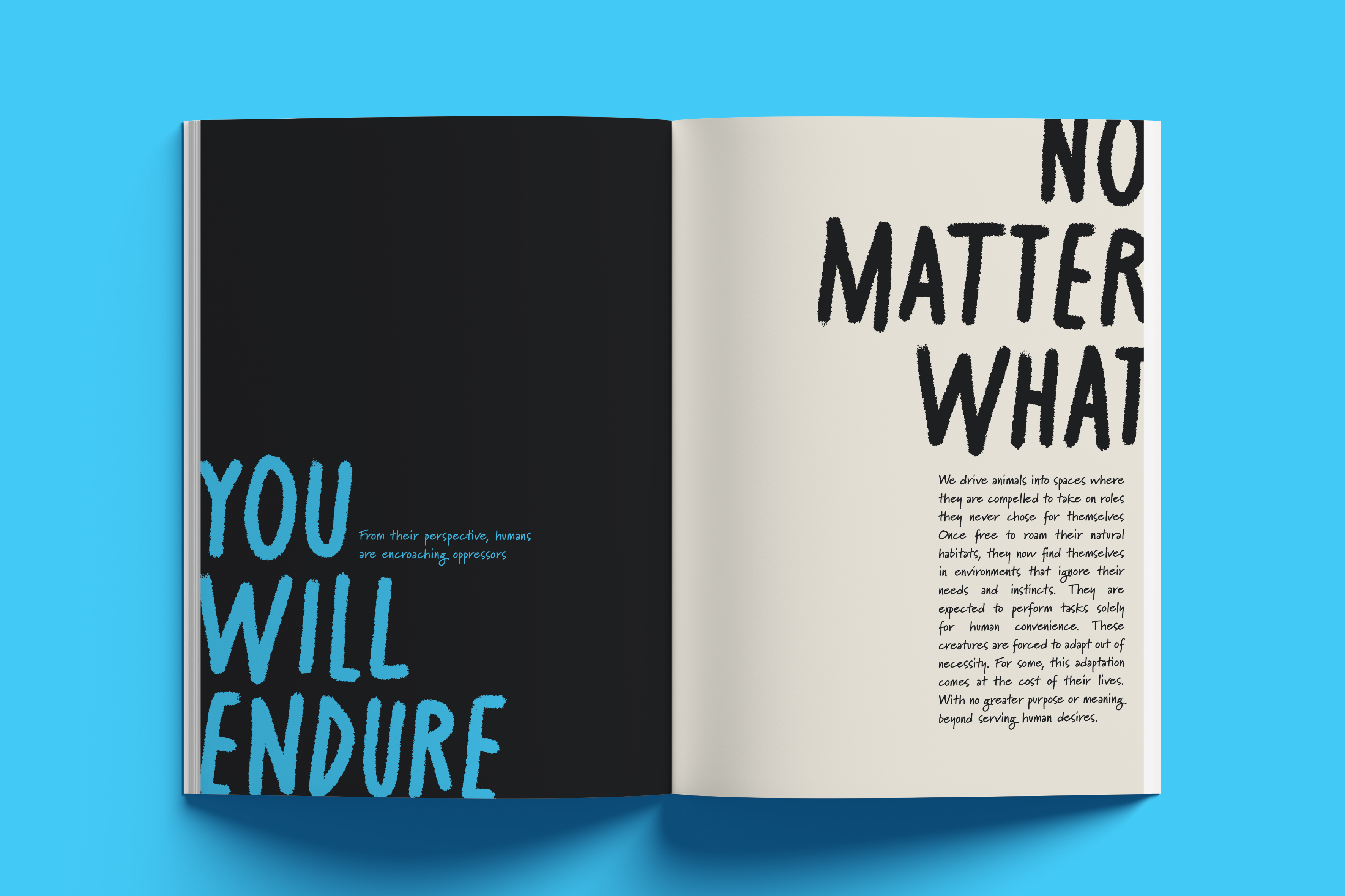 Through the contrasting narratives of "You Don’t Belong Here" and "You Will Belong Here", this zine series sheds light on the often-overlooked consequences of human dominance over animals in shared environments. As some species are exterminated as intruders while others are commodified for human use, revealing the contradictions in how humans decide which lives are permitted to exist.